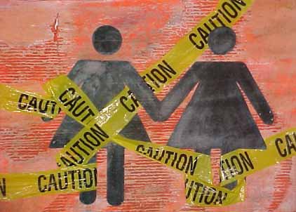 | Description of Submission: "The piece represents the view of lesbianism from anyone viewing it as a "practice" or by those venturing to participate and accept themselves as lesbian, or others viewing a lesbian relationship from the outside. It is viewed as somethign that needs to be proceeded into with caution or viewed carefully or cautiously. The idea of homosexuality is not one viewed with comfort by the majority of the population including those who are themselves homosexual. The work partially illustrates my own coming to terms with my sexuality, through i had come out to myself several years prior and to my family the year before, i was just beginning to think of myself as out to those around me on a daily basis. The piece is 36" x 24", spray paint and detergent on cardboard, overlay of water soluble oil pastel on bristol board and collected "caution" tape." - Christina |