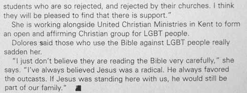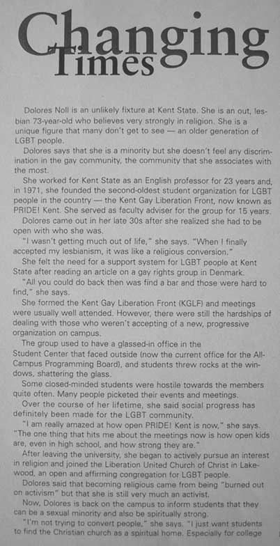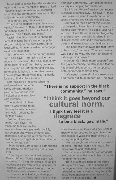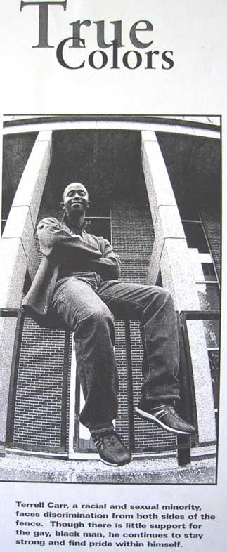 | Description of Submission: "Three separate profiles of different individuals who are members of the LGBT community and another minority." - Steven Why Karen and Melody Liked It: It was a very interesting 3 part article dealing with 3 different profiles of different individuals in the GLBT community. It was exceptionally well written. Very good quotes were used and the piece flowed smoothly together. And it tied the theme of being dual minorities. |