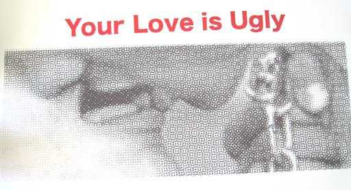 | Description of Submission: "Silkscreen. This piece is supposed to invoke critical thinking and confront stereotypes by deconstructing the power of suggestive meaning in images and words. First, the piece is composed of an image and text ("your love is ugly). The image, when seen up close, is difficult to determine what it is. Although, the image associated with the "your love is ugly" text suggests a particular statement to evoke anger and judgement. While stepping back the picture becomes clearer and it reveals that it is two people kissing. Then the image and text start to work together, but still the meaning of the piece is ambigous. The picture is cropped so that it is hard to tell the genders; is it a man kissing awoman, a woman kissing a woman, a man kissing a man? Thus this piece trying to cmmunicate an "ugly love" is unsuccessful because it could be either implying heterosexual, homosexual, bisexual, transgender sand so forth. The answer is that there is no such thing as an ugly love. The act of trying to convince someon a certain way to love is unsuccessful, since we all love in a different unique ways regardless of what gender our partner happens to be."" - Jeremie Rujanawech |