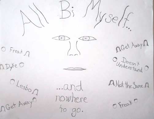 | Description of Submission: "This is a drawing telling why it is hard being bi. On one side, there are straight couples calling the person in the names. On the other side, you have gay and lesbian couples saying how it is nto the same. The person in the middle is sometimes not accepted by either side." - Kerriann |