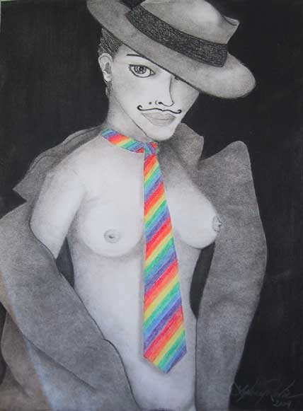 Description of Submission: The woman is drawn in charcoal and her tie in color to represent society's focus on thehomosexuality rather than the person. She is shadowed behind a lable, yet her cross dressings is not a deception, but a reflection of self-perception.