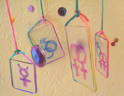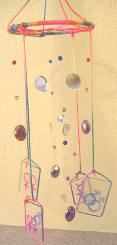 Description of Submission: "I wanted to do creative piece that was colorful, unique and exhibited gay pride. On each hanging piece of glass there are commonly used symbols representing the GLB or T lifestyle. I used different sized gems and mirrors so that when the light hits them they project rainbows around the room it." - Kristina