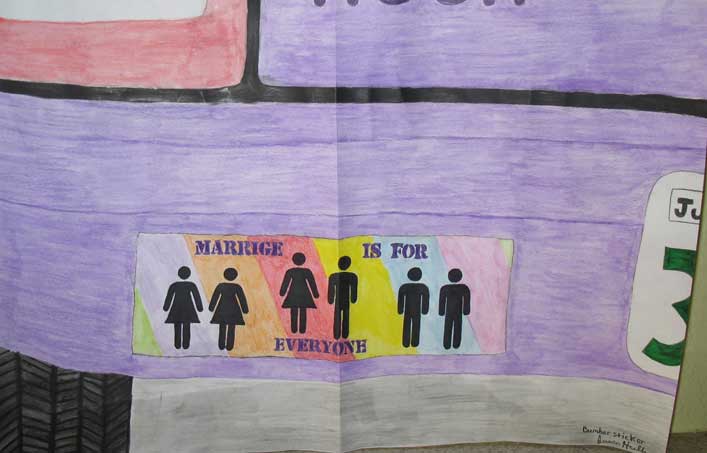 Description of Submission: "During the 2004 electrion I saw many cars with marriage = man + woman. I hated these stickers + tried to get one so I could cut up and put marriage = men + men or women+women. This was never realized as I couldn't get one of the bumper stickers. This is a water color pencil drawing of the back of my car with the bumper sticker I want." - Jessica