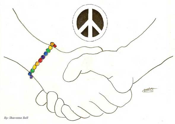 | Description of Submission: "Drawing showing how when we stop judging we can be at peace when accepting others based on sexual orientation." - Shavonne Why Karen and Melody Liked It: We liked how the drawing showed that we can attain piece if we can all just come together and stop judging each other. It was a simple picture but it spoke volumes. |