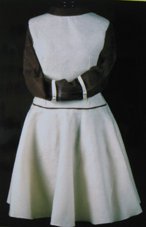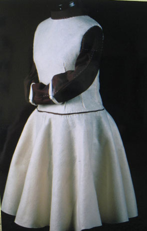 | Description of Submission: "A hand sewn felt dress that is a mix between dress and straight jacket. It ismy way of trying to deal with feminity, and feeling trapped at times by my female body, and gender in general. it is made in my size, and is completely wearable." -- Ashleigh Why Karen and Melody Liked It: It was very unique to show the gender struggle through a dress. Very creative! |