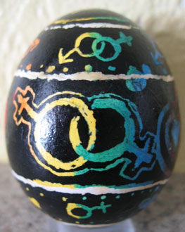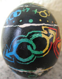 | Description of Submission: "This is a decorated egg. It's done in the Ukranian pysanky method of layering dyes, protecting previous layers with wax. The innards have been blown, leaving a permanent, decorated shell." - Alikina Biography: Alikina is attending University of Colorodo. She will be a Junior majoring in Psychology. Why Melody Liked It: It was such a unique medium to use an egg to show gay pride and symbols. It was beautifully done and took a lot of skill to make. |