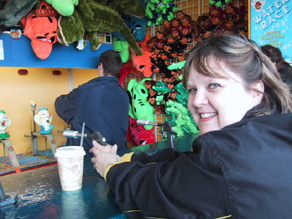 | They had the boardwalk open for the festival with some of the rides and the carni games operating. Melody and I decided to try our luck on a balloon water race. I'm ready here to shoot that stream of water into the clowns mouth and bust that balloon. We lost but at least I looked cute! |