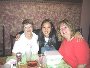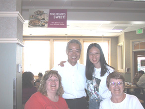 | Melody's dad Bell, wanted to meet Karen's mom. So we all had lunch together. This gave Bell and Pat a chance to get to know one another and brag about each other's daughter. Melody's dad bragged about Karen and Karen's mom bragged about Melody! We are all just one happy family!! |