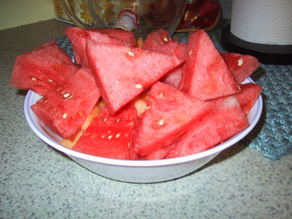 | We couldn't forget dessert. Tastty pieces of watermelon and cantelop are cut to perfection, and devoured quickly. What a way to end a feast! |