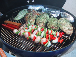 | Veggies on skewers, chicken and baked potatoes getting cooked to perfection. Yum, I can't wait to start eating! |