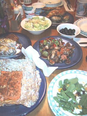 | Our table is filled with all the yummy foods we grilled. Everything from chicken, shrimp and salmon to veggies and baked potatoes. You would never have guessed that only 3 of us were there for dinner! |