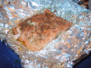 | We cooked some salmon to let Mom try some. She had never has salmon before and wanted to try it. Doesn't that look good? |