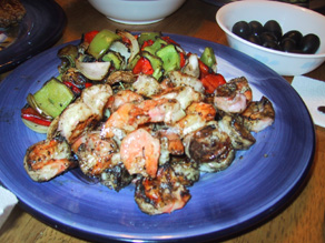 | Grilled shrimp along with the vegetables from the skewers. We had musharooms, peppers and onions to chose from. |