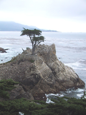 | This is the famous "Cypress Tree" on the Seventeen Mile Drive in Monterey. While Melody still doesn't get it, it's supposed to represent one tree's determination to stand against all odds and survive. Quite poetic actually! |