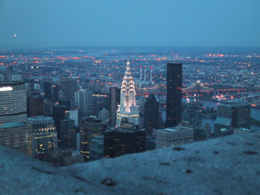 | Here is a view at night from the top of the Empire State Building. You can see the Chrysler Building all lit up. |