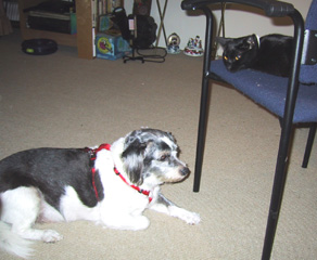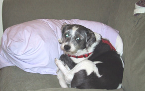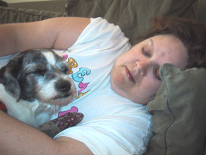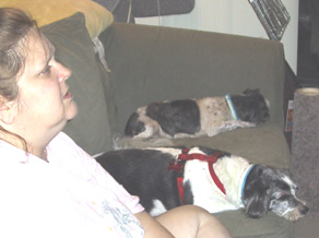 | Karen, Pooter and Princess together on the couch. Pooter was never far from Karen's side, even if they were just watching TV. |