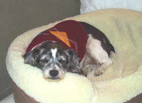 | Pooter, dressed in his sweater, sleeping in his own bed, a rare occasion. He sometimes liked to sleep in Princesses bed, but it was too small for him. Melody got him one of his own, but he still preferred to sleep in Princesses. |