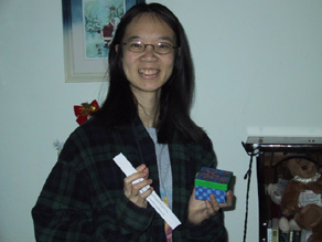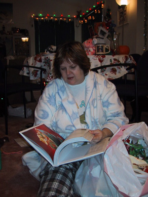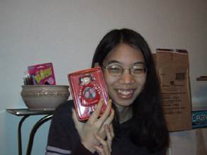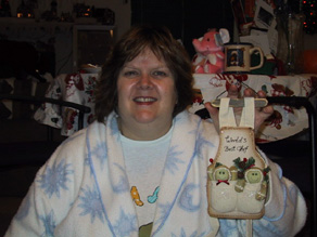 | Jenny smiles with her gift from Melody. It's a "Sisters" ornament with a picture of her and Melody inside. |