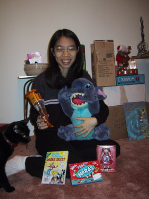 | Nike checks out Jenny's gifts to see if there is anything she wants from the pile. Jenny got the stuffed Stitch, the sisters ornament, a comic book, some candy and a bag of snack food that she likes to eat. |