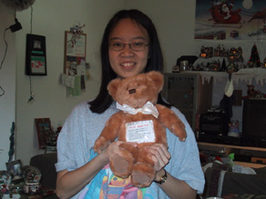 | Karen's mom sent Melody this cute bear. He has a place on his tummy for you to put a picture. Melody put in one of our good Christmas pictures so that he would always have us close to his heart. Isn't he cute? |