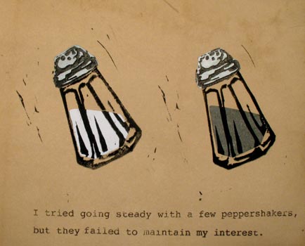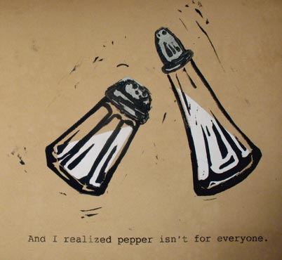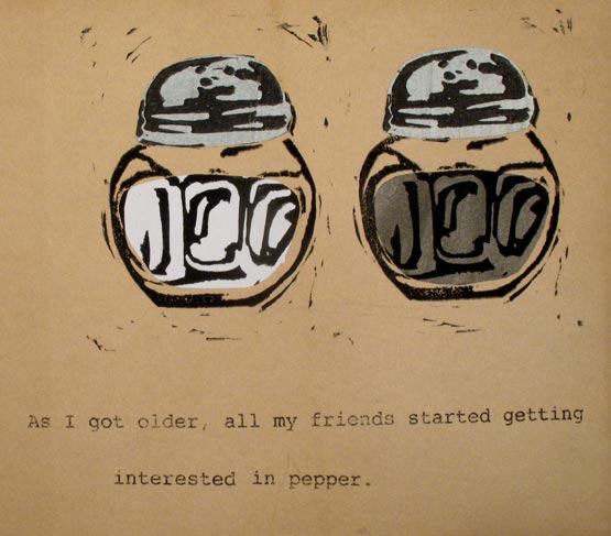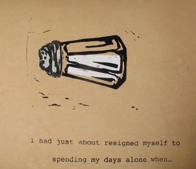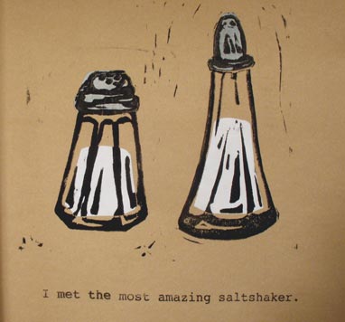 Description of Submission: This is a short artists book I made by dying paper with coffee and creating rubber stamps for the shakers. I used xerox transfers for the text. It's a 6 page book; the cover and each page are attached. It is bound with string.