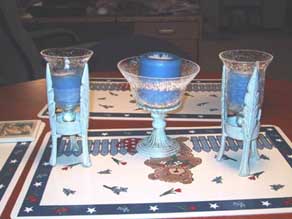 | This candle set was Karen's gift to Melody. The blue candles are for Melody's favorite color. We lit the candles for our Anniversary dinner. |