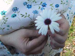 | Karen playing, "She love me, she loves me not" with the petals of this daisy. Of course, when she got down to the last few, she cheated and said, "She loves me, She loves me, She loves me!" |