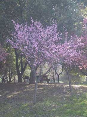 | Some of the trees were just beginning to bloom. The pink blossoms on this tree were so pretty and a nice contrast to the green leaves on the other trees. |